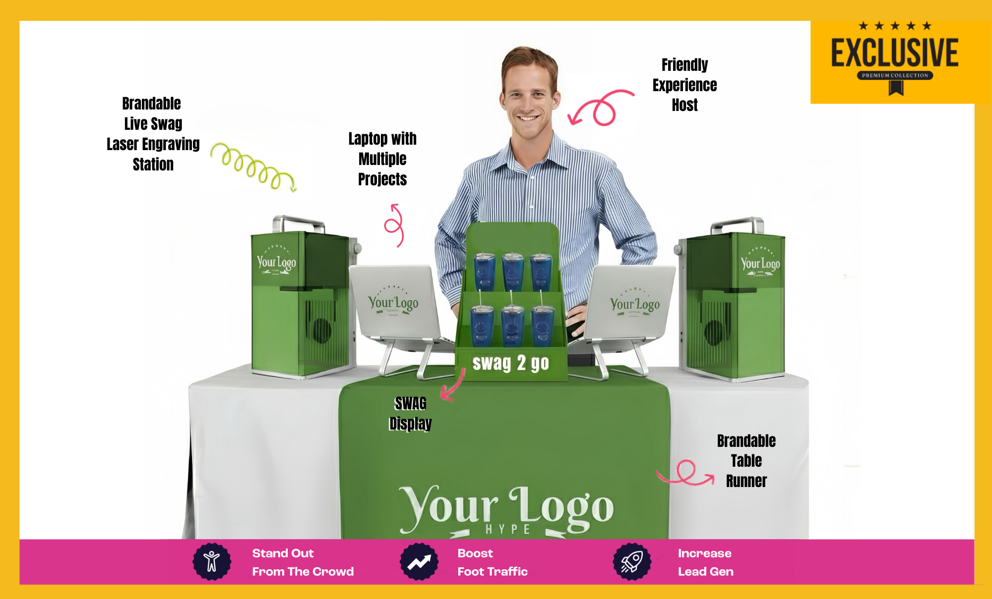 - Boosts brand visibility and booth traffic